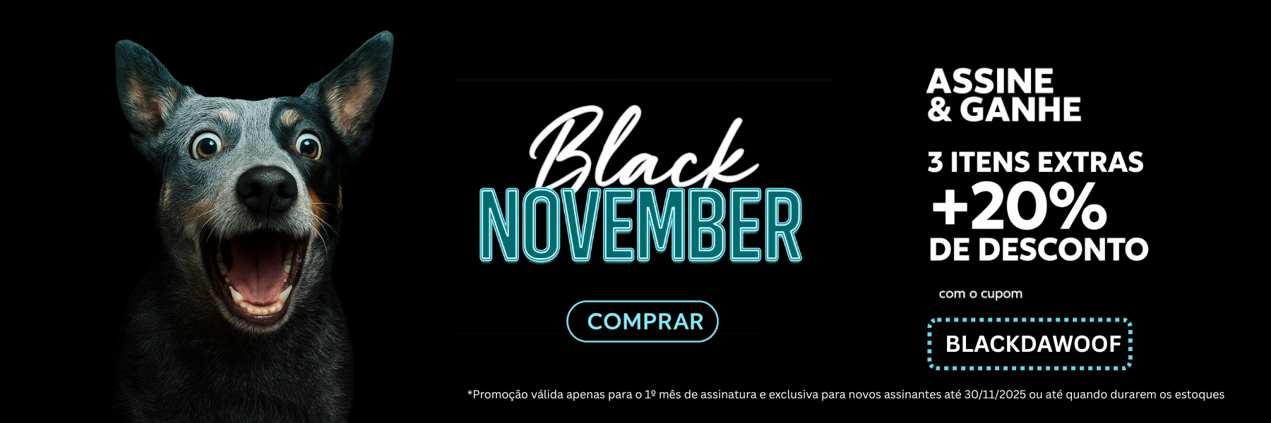 Box com 3 itens sortidos. Frete grátis para SP. Renovação automática mensal. Plano sem vigência mínima ou fidelidade. Cancele quando quiser. Pagamento por cartão de crédito, boleto ou PIX. 10% de desconto na WoofShop